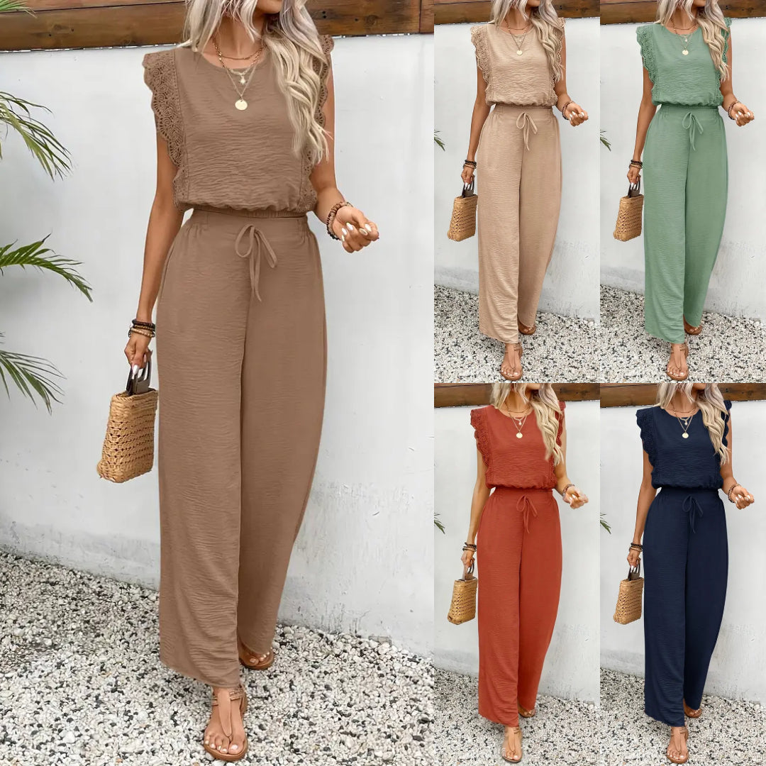 The Sophia Lace Trim Two-Piece Set is the epitome of elegance and comfort, designed for the modern woman who values both style and versatility. This sophisticated ensemble features a sleeveless vest with intricate lace detailing and full-length trousers that create a sleek, elongated silhouette. Made from premium polyester fabric, it ensures comfort and durability while maintaining a polished look throughout the day.